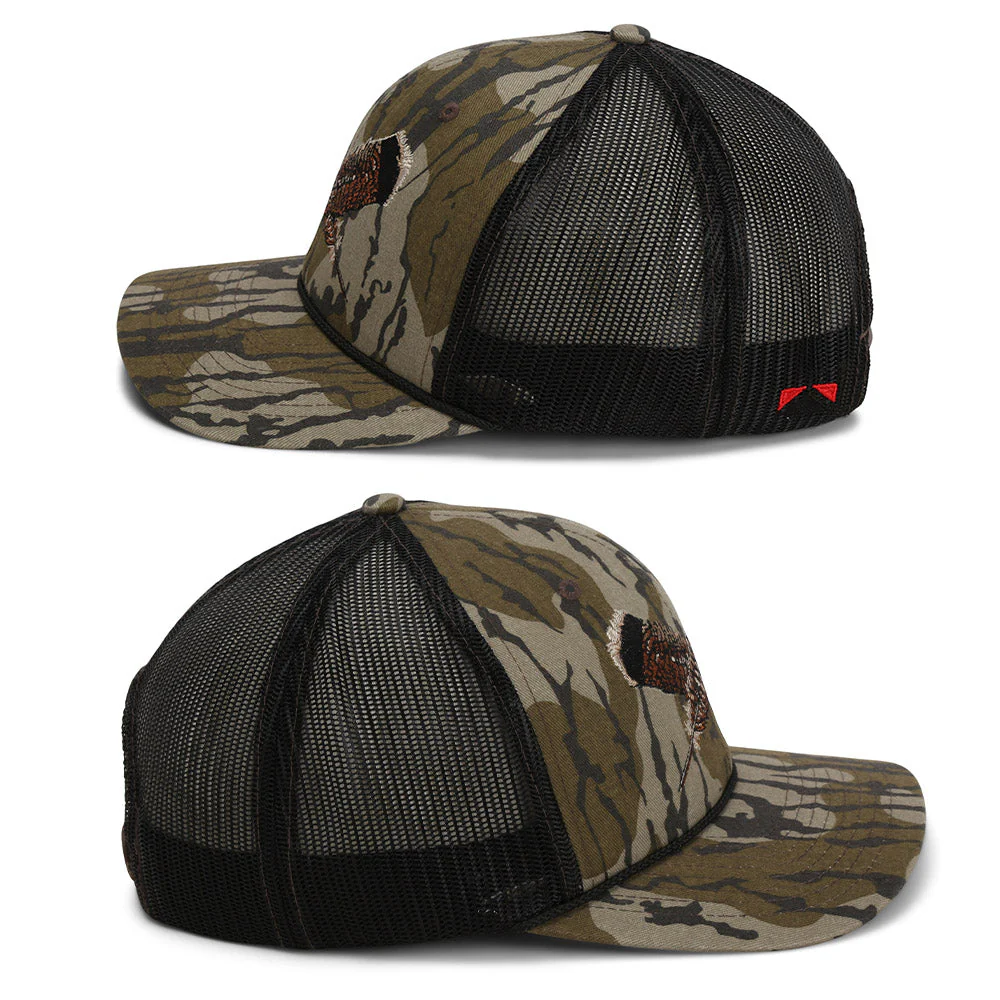 Our Turkey Feather 6-panel Mossy Oak Bottomland camo cap features a cotton twill Mossy Oak Bottomland front. Coupled with a mesh back, front rope, and a slightly curved visor. Additionally, this turkey hunting cap features our COMFORT SNAP™ elastic closure which couples the stretch fit of a custom cap with the adjustability of a snapback. Lastly, the Mossy Oak Turkey Feather cap features American Fit™ sizing which fits men's head sizes MD - XX.